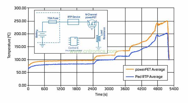 圖4:在緩慢的熱失控情況下,RTP200器件會(huì)追蹤powerFET溫度,當(dāng)溫度達(dá)到200℃時(shí),它就會(huì)斷開(kāi)電路。