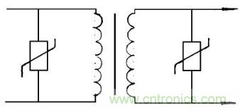 圖6中在特殊條件下使用的照明燈具, 要求極為嚴(yán)格, 采用了隔離變壓器, 這時(shí)壓敏電阻應(yīng)在隔離變壓器的初級(jí), 次級(jí)線圈繞組兩端同時(shí)使用壓敏電阻器, 它能吸收抑制來(lái)自輸入電壓的浪涌, 過(guò)壓雷擊或開(kāi)關(guān)引起的電火花干擾等。