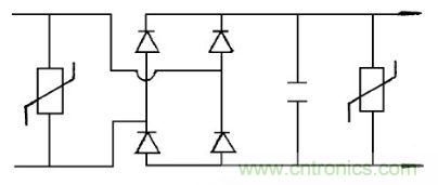 在圖10線路中壓敏電阻并聯(lián)在橋式整流的輸入端、輸出端, 防止和保護(hù)由輸入的交流電過(guò)電壓、反電動(dòng)式的過(guò)電壓、雷擊; 開(kāi)、關(guān)產(chǎn)生的過(guò)電壓, 使整流元件不受過(guò)電壓的損傷, 減少開(kāi)機(jī)的噪聲。