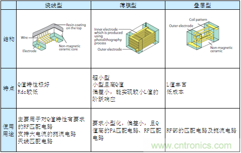 疊層型構(gòu)造雖有3種結(jié)構(gòu)且Q值也較低,但由于其L值偏差及規(guī)格、價(jià)格等整體的平衡性較好,因此被廣泛使用于RF的匹配電路、共振電路及扼流電路中。