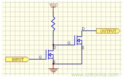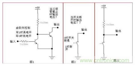 我們將圖1簡化成圖2的樣子。圖2中的開關受軟件控制,“1”時斷開,“0”時閉合。很明顯可以看出,當開關閉合時,輸出直接接地,所以輸出電平為0。而當開關斷開時,則輸出端懸空了,即高阻態。這時電平狀態未知,如果后面一個電阻負載(即使很輕的負載)到地,那么輸出端的電平就被這個負載拉到低電平了,所以這個電路是不能輸出高電平的。