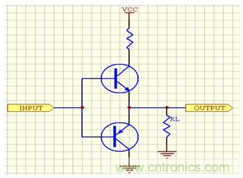 集電極開路輸出的結構如圖1所示,右邊的那個三極管集電極什么都不接,所以叫做集電極開路(左邊的三極管為反相之用,使輸入為"0"時,輸出也為"0")。對于圖1,當左端的輸入為“0”時,前面的三極管截止(即集電極C跟發射極E之間相當于斷開),所以5V電源通過1K電阻加到右邊的三極管上,右邊的三極管導通(即相當于一個開關閉合);當左端的輸入為“1”時,前面的三極管導通,而后面的三極管截止(相當于開關斷開)。