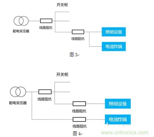 解決方法:發現問題后解決就比較簡單了,使大功率負載(電油炸鍋)單獨使用一條電纜后,問題解決,如圖3、圖4所示。