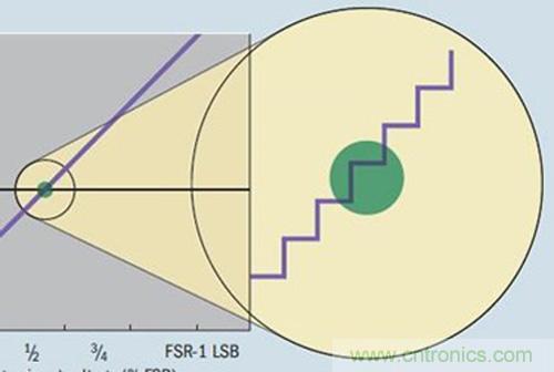 A/D轉(zhuǎn)換器的分辨率被定義為輸入信號值的最小變化,可通過一次計數(shù)改變數(shù)字輸出值。就理想的A/D轉(zhuǎn)換器而言,傳遞函數(shù)呈階梯狀,且每個步階寬度等于分辨率。但使用較高分辨率(16位或16位以上)的系統(tǒng)時,傳遞函數(shù)的響應和理想的響應之間將存在較大的偏差。這是因為由A/D轉(zhuǎn)換器及驅(qū)動器電路產(chǎn)生的噪聲可降低該轉(zhuǎn)換器的分辨率。