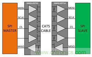 SN65LVDT41和SN65LVDT14的架構可以使整條SPI總線轉化為支持LVDS:同一方向上用于MOSI,SCLK和CS信號的4個收發(fā)器,相反方向上用于MISO信號的1個收發(fā)器。LVDS芯片組也具有內置端接帶來的額外優(yōu)勢,應用簡單,還可以減少電路板空間本就非常寶貴的應用中的組件數(shù)量。圖2顯示的是使用上述芯片組的一個已擴展SPI總線架構的組成結構。這個實現(xiàn)方式并不要求必須使用5類屏蔽雙絞線(STP),但是如果使用此類線纜的話,會使這種架構的實現(xiàn)方式更加簡單。