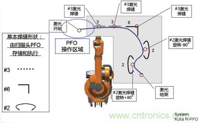 除了激光拼焊,激光飛行焊也已經被廣泛應用于汽車車身及其他零部件的焊接。激光飛行焊是將振鏡焊接頭與機器人的運動結合起來,實現高效靈活的激光焊接。振鏡(PFO)及飛行焊的原理見圖4、5、6。其中PFO可以通過兩片鏡片的旋轉,實現激光焦點在工件上的快速靈活移動和定位,可以大大提供激光焊接時的動態性能,更加高效。而機器人則可以擴展焊接范圍,以實現更大零件的焊接。兩者的結合,則可以實現優勢互補,達到高效、靈活、低成本的激光焊接。