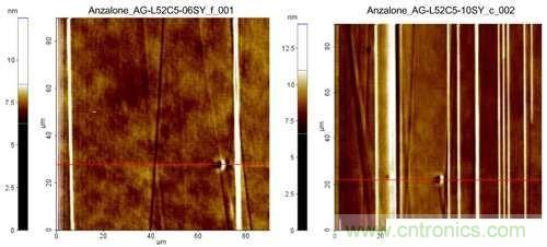 圖3.不同蝕刻時間會在晶圓表面留下不同程度的階褶。圖左的蝕刻時間為二分之一參考時間,圖右為三倍參考時間。