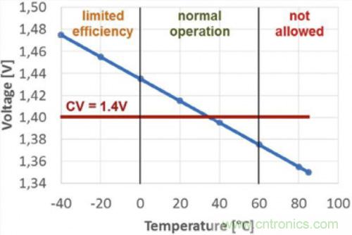 圖2.每電芯1.40 V充電電壓與溫度的關(guān)系
