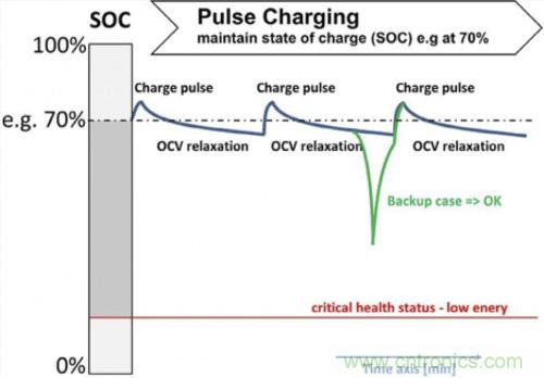 圖5.典型的維護(hù)充電 – 充電脈沖使荷電狀態(tài)處于定義的高水平。OVC 休息取決于荷載情況和自放電。對于典型的后備應(yīng)用,荷電狀態(tài)必須高到足以滿足電能需求。