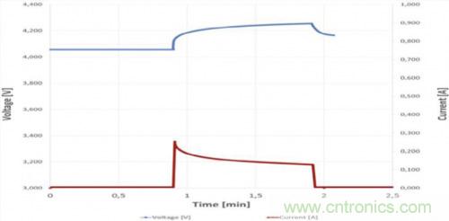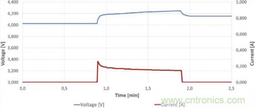 圖6a.6小時(shí)后的首個(gè)維護(hù)充電脈沖(1分鐘)(90 F 4.2 V系統(tǒng)示例)
