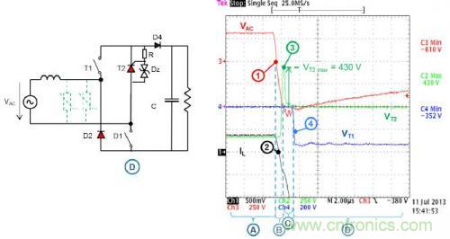 我們在90°相角施加4KV正浪涌電壓,如圖2的示意圖所示 (無PFC)。為模擬最惡劣的應用環境,我們為L選用一個2 µH電感,C是一個100 µF電容??煽毓枵鞴苁莾蓚€50A的TN5050H-12WY,而D1、D2和D4二極管(PFC旁通二極管)是STBR6012-Y整流管。