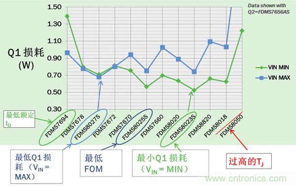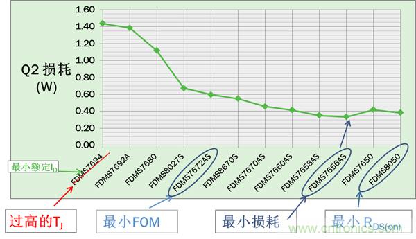 對于Q2,VIN= VINMAX時損耗最大。圖3所示的12個器件中,F(xiàn)DMS7656AS有最低的最大損耗。但由于Q2 寄生參數(shù)會影響Q1的 開關(guān)損耗, 最小Q2 損耗通常并不意味著最佳的總能效。必須比較Q1及Q2的總功耗來找到最佳的Q2以實(shí)現(xiàn)最高能效。