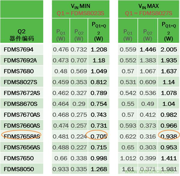 為優(yōu)化轉(zhuǎn)換器能效,首先根據(jù)VIN選擇損耗最小的Q1,然后選擇產(chǎn)生損耗最小的Q2。本例中, 無論VIN最小或最大,最佳的Q2是相同的,都為FDMS7658AS(但并不總是如此,特別是具有寬VIN范圍或高FSW時)。