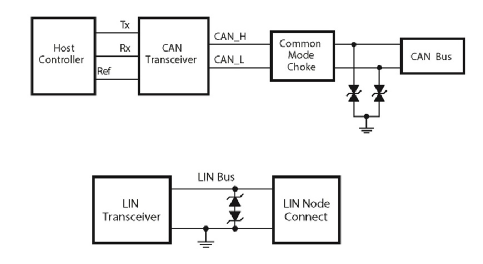 下圖所示的是 CAN 和 LIN 總線的典型 ESD 保護(hù)方案。由于 CAN 總線是雙通道電路,最常見的解決方案是采用一個雙通道二極管陣列。LIN 總線為單通道,因此它的 ESD 解決方案采用的是分立 ESD 二極管或多層壓敏電阻。