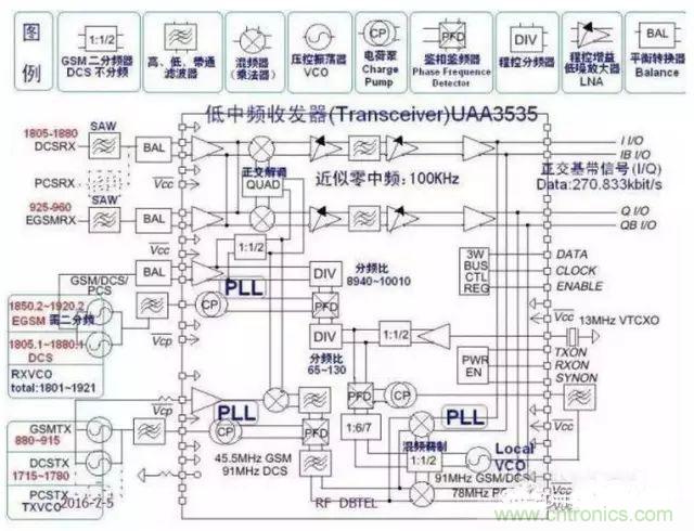 1.收發(fā)器(Transceiver)收發(fā)器即調制解調器調制:發(fā)射時基帶信號加載到射頻信號解調:接收時射頻信號過濾出基帶信Transceiver根據其工作頻率可分為:單頻、雙頻、三頻等Transceiver根據其中頻特征可分為有中頻、零中頻、近零中頻等以DB2009為例介紹Transceiver UAA3535的內部結構UAA3535是近零中頻收發(fā)器,它最多可以作三頻收發(fā)它內部有:三個PLL(包括一個內置VCO)、正交混頻解調器、可控增益低噪放大器、混頻調制器等它需外接:13MHz參考基準時鐘、RXVCO、TXVCO、基帶控制信號等我們需要研究其內部各重要節(jié)點的頻率、帶寬,信號轉換的流程等細節(jié)
