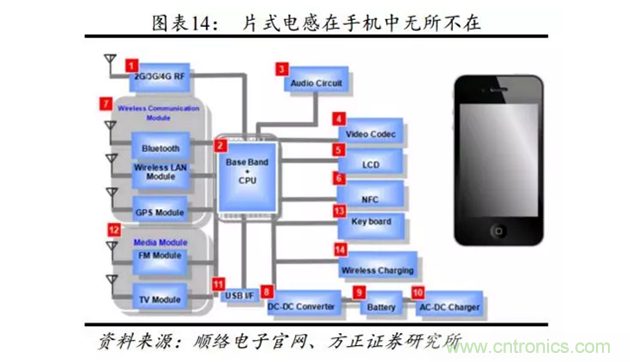 公司主要業務是以片式電感為主的片式電子元器件。公司產品戰略轉型,從國產替代到提供創新產品的解決方案。新產品不斷豐富,收購信柏陶瓷,技術實力雄厚,打造磁性材料和陶瓷材料雙平臺。以開放式、全面合作為路線,未來進入軍工、汽車等領域,大體量帶來高成長。疊層片式電感占全部電感器的市場份額最多,約85%。