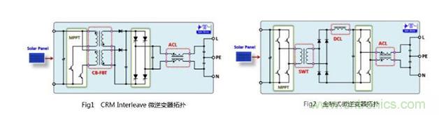 Fig1、2所示微逆變器是比較典型的兩種并網發電拓撲。Fig1中首先采用兩個交錯式臨界工作方式的升壓反激式變壓器,將其占空比按照正弦波半波規律,通過單級電路的電力的正弦化、隔離升壓和MPPT(MaximumPowerPointTracker)控制濾波,然后再全橋半波工頻換相濾波,高效地實現了低壓直流的直接并網發電。這是目前最具有潛力的微逆變器工作方式之一。Fig2則是通過全橋隔離升壓、濾波,再進行全橋逆變濾波并網的常規方式。這種方式的明顯缺點就是需要較多的磁元件,且高頻開關器件過多,成本和效率方面優勢不足,且電路為了簡化,無一例外地采用了硬開關驅動,這樣隔離主變壓器的漏感要非常小,一般不得不采用多層電路板扁平變壓器結構,使得其寄生電容大,成本高,EMI也比較難處理。