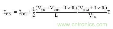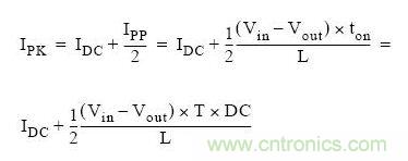 通過(guò)上圖我們可以看到,流過(guò)電感的最大電流為DC電流加開(kāi)關(guān)峰峰電流的一半。上圖也稱(chēng)為紋波電流。根據(jù)上述的公式,我們可以計(jì)算出峰值電流: