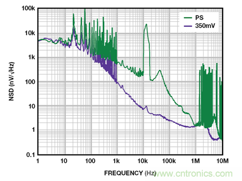 當(dāng)裕量為 350 mV 時,LDO 采用壓差工作模式。此時,LDO 再也不能調(diào)節(jié)輸出電壓,充當(dāng)一個電阻,輸出噪聲升至近 76 μVrms,如圖 9 所示。只有 FET 的 RDSON和輸出端的電容形成的極點衰減輸入噪聲。