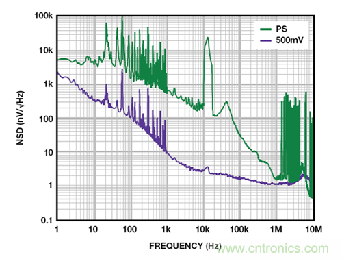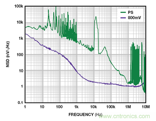如 ADM7150 超低噪聲、高 PSRR 調(diào)節(jié)器一類的新型 LDO 實際上級聯(lián)了兩個 LDO,因此,結(jié)果得到的 PSRR 約為各個級之和。這些 LDO 要求略高的裕量電壓,但能夠在 1 MHz 條件下實現(xiàn)超過 60 dB 的 PSRR,較低頻率下,PSRR 可以遠(yuǎn)超 100 dB。圖 7 所示為一個 5 V 的 ADM7150 的噪聲頻譜密度,其負(fù)載電流為 500 mA,裕量為 800 mV。10 Hz 至 100 kHz 范圍內(nèi),輸出噪聲為 2.2 μV rms。隨著裕量降至 600 mV,整流諧波開始顯現(xiàn),但當(dāng)輸出噪聲升至 2.3 μV rms 時,其對噪聲的影響很小。