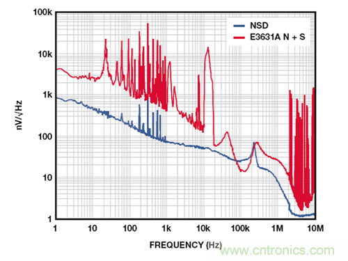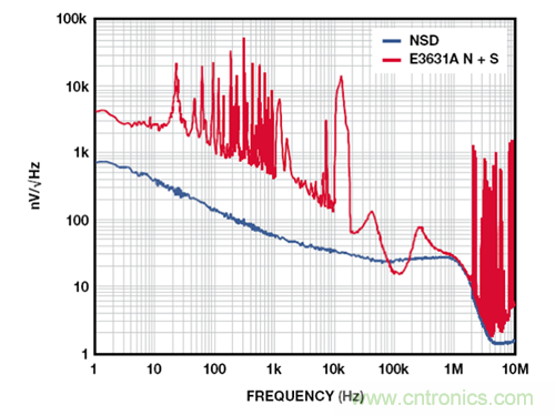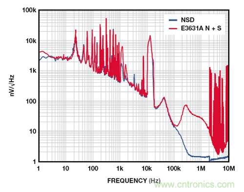 圖 4 展示的是 2.5 V ADM7160 在 500 mV 裕量和 100 mA 負(fù)載條件下,相對于 E3631A 臺式電源的輸出噪聲,該臺式電源在 20 Hz至 20 MHz 范圍內(nèi)的額定噪聲低于 350 μV-rms。1 kHz 以下的許多雜散為與 60 Hz 線路頻率整流相關(guān)的諧波。10 kHz 以上的寬雜散來自產(chǎn)生最終輸出電壓的 DC-DC 轉(zhuǎn)換器。1 MHz 以上的雜散源于環(huán)境中與電源噪聲不相關(guān)的 RF 源。在 10 Hz 至 100 kHz范圍內(nèi),這些測試所用電源的實測噪聲為 56 μV rms,含雜散為104 μV。LDO 抑制電源上的所有噪聲,輸出噪聲約為 9 μV-rms。