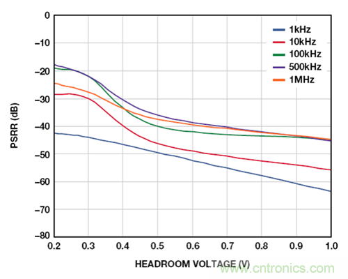 隨著裕量電壓的減小,PSRR 也會減小,壓差可能變得非常大。例如,在 100 kHz 下,裕量電壓從 1 V 變?yōu)?500 mV,結(jié)果將使PSRR 減少 5 dB。然而,裕量電壓的較小變化,從 500 mV 變?yōu)?00 mV,結(jié)果會導(dǎo)致 PSRR 下降 18 dB 以上。