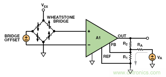 例如,在各元件的容差均為 0.1%且激勵(lì)電壓為 5 V 時(shí),差分失調(diào)可以高達(dá)±5 mV。如果需要 400 的增益來實(shí)現(xiàn)所需電橋靈敏度,則放大器輸出端的失調(diào)變成±2 V。假設(shè)放大器由同一電源驅(qū)動(dòng),并且其輸出可以軌到軌擺動(dòng),則僅電橋失調(diào)就可能消耗掉 80%以上的輸出擺幅。在行業(yè)要求電源電壓越來越小的趨勢(shì)下,這個(gè)問題只會(huì)變得更加糟糕。