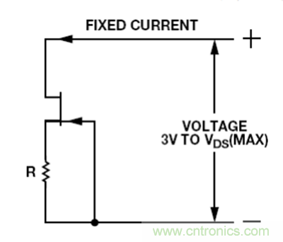 若精度不是問題,且只要求剛性單極性電流源,則可以采用耗盡型JFET和一個(gè)電阻組成電流源。如圖 12 所示,這種配置在溫度發(fā)生變化時(shí)并不十分穩(wěn)定,且對(duì)于給定的R值,各器件的電流可能有相當(dāng)大的差異,但該配置簡單而廉價(jià)。