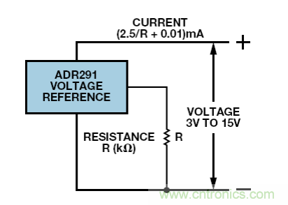 目前為止,我們討論的電路都是具有精密電流輸出的放大器。當(dāng)然,它們能夠與固定輸入一同使用,提供精密電流源,但構(gòu)建一個(gè)更簡單的雙端電流源也是可行的。低電流基準(zhǔn)電壓源ADR291 具有 10 μA左右的待機(jī)電流,典型溫度系數(shù)為 20nA/°C。如圖 11 所示,加入負(fù)載電阻后,則 3 V至 15 V電源范圍內(nèi)的基準(zhǔn)電流為(2.5/R + 0.01) mA,其中R為負(fù)載電阻,單位是kΩ。