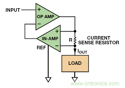 現(xiàn)在,高性能儀表放大器售價(jià)不高,因此使用一個(gè)運(yùn)算放大器、一個(gè)儀表放大器和一個(gè)電流檢測電阻組成雙極性電流源極為方便,如圖 10 所示。這類電路比Howland電流泵要更為簡單,不依賴于電阻網(wǎng)絡(luò)(除了集成儀表放大器的那種),且電壓擺幅在每個(gè)電源的 500 mV以內(nèi)。