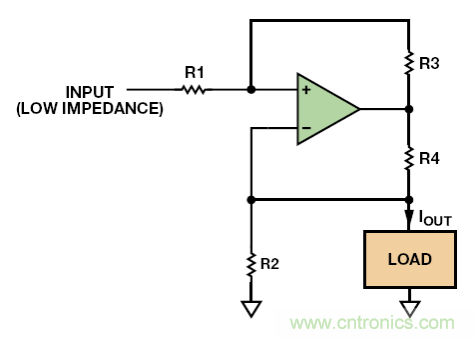 目前為止,我們討論的電路都是單極性的——電流在一個(gè)方向上流動(dòng)——但雙極性電流電路也是可行的。最簡單、使用最廣泛的當(dāng)數(shù)Howland電流泵,如圖 9 所示。這款簡單的電路有很多問題:它對(duì)電阻匹配的精度要求極高,以獲得高輸出阻抗;輸入源阻抗會(huì)增加R1 電阻,因此它的數(shù)值必須非常低以最大程度降低匹配誤差;電源電壓必須比最大輸出電壓高得多;并且運(yùn)算放大器的CMRR性能必須相對(duì)良好。