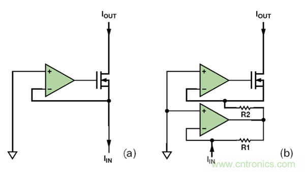 電流鏡具有相對(duì)較高、有時(shí)非線性的輸入阻抗,因此它們必須由高阻抗電流源(有時(shí)亦稱為剛性電流源)提供電流。若輸入電流必須具有低阻抗吸電流能力,則需使用運(yùn)算放大器。圖 6所示為兩個(gè)低ZIN電流鏡。