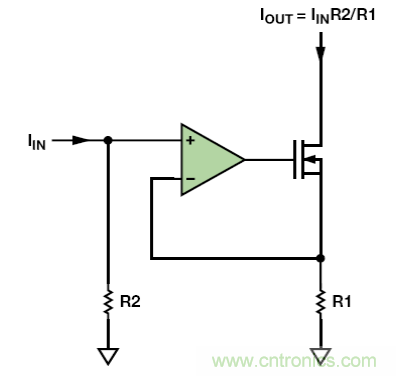 若單芯片IC中需要用到電流鏡,則最好使用簡單的晶體管電流鏡。然而,若采用分立式電路,其匹配電阻高昂的價(jià)格(價(jià)格高是因?yàn)樾枨罅坑邢蓿侵圃炖щy)將使圖 5 中的運(yùn)算放大器電流鏡成為最便宜的技術(shù)。該電流鏡由跨導(dǎo)放大器和一個(gè)額外的電阻組成。