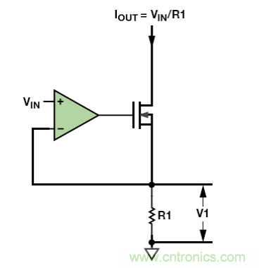 該電路簡單、價(jià)格不高。MOSFET柵極上的電壓可設(shè)置MOSFET中的電流和R1,使R1 上的電壓V1 等于輸入電壓VIN。