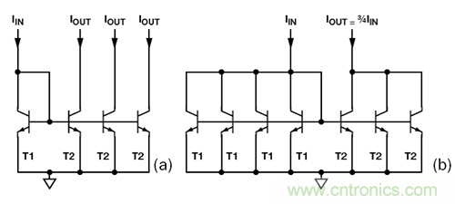 圖2. (a) 多級(jí)電流鏡 (b) 非整數(shù)比例電流鏡可將 3 個(gè) T2 集電極結(jié)合起來,得到 3IIN