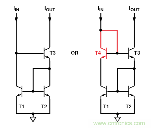 若早期電壓影響很大,則可使用略為復(fù)雜的威爾遜電流鏡降至最低。3 晶體管和 4 晶體管版本如圖 3 所示。4 晶體管版本更為精確,且具有更寬的動(dòng)態(tài)范圍。