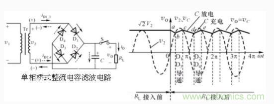 時電容放電,輸出下降。如此充電快,放電慢的不斷反復,在負載上將得到比較平滑的輸出電壓。當負載電阻越大時,放電越慢,紋波電壓越小,負載電阻小時,放電快,紋波大,而且輸出電壓低。
