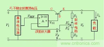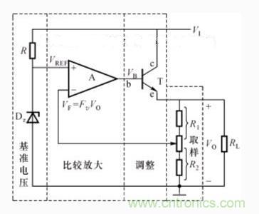 VI是整流濾波后的電壓,T為調整管,A為比較放大電路,VREF為基準電壓,它由穩壓管Dz與限流電阻R構成。R1與R2組成反饋網絡,是用來反映輸出電壓變化的取樣環節。