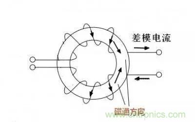 共模電感會飽和嗎?答案是非常難飽和,通常情況下無需擔心飽和問題,為什么呢?我們先來看看差模電流流過共模電感的情況。如圖,差模電流電流電感時其磁通是相互抵消的,也就是說,在磁路里基本沒有磁通產(chǎn)生,差模電流流過時沒有阻力,沒有損耗,簡單說,一個額定電流5A的共模電感流過100A的差模電流也不會飽和,當然前提是導(dǎo)線夠粗。