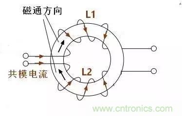 假設(shè)一對共模電流流向如下圖所示,兩個濾波電感各自獨立,沒有磁通上的聯(lián)系,這樣能不能濾波共模電流呢?當然也能,相當于差模電感,各自為戰(zhàn),效果差一點。