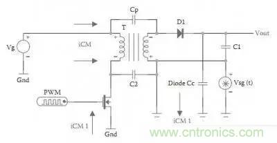 共模干擾由MOS管的高di/dt引起,經(jīng)過變壓器間的電容Cp或雜散電容C2傳到副邊,以Cp為主,C2基本可忽略。我們知道Cp很小,因此能傳到副邊的干擾頻率一定很高,低頻干擾信號過不去,因此EMI測試中的高頻部分基本就是共模干擾。究竟多少MHz與變壓器的結(jié)構(gòu)有很大的關(guān)系,層間電容大了則可能1MHz的共模能過去,層間電容小了,則只能是更高的頻率能過去,比如5MHz以上。