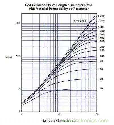 圖中橫坐標是磁棒的長度與直徑之比,隨長度變短氣隙變小等效磁導(dǎo)率也變小,這好像不合理,我們看磁環(huán)的電感計算公式: