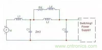 這是用的最多的一種,如圖,通常都僅僅在電感上并聯(lián)一個阻尼電阻,這個阻尼電阻不可少,曾經(jīng)看到有些貼問這個電阻干什么用,有各種說法,但很少有說對的,請記住這個是阻尼電阻,為了消除干擾信號在濾波器的截止頻率處產(chǎn)生尖峰,達到243樓的的幅頻特性的加阻尼后的效果。有人說前面一個C1電容可以省去,這個說法不對的,我們前面已講過,每加一個儲能元件 L 或 C,濾波器的階數(shù)并升高一階,對信號的衰減可以增加20dB/十倍頻程,pi 濾波器是三級濾波器,把C1拿掉后變成了二階,濾波效果會打折扣。