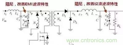 這是一個正激電源,請?zhí)貏e注意,輸入LC的EMI濾波器和輸出的紋波濾波器都有一個電容串聯(lián)電阻的阻尼電路,阻尼作用前面已多次提及。特別注意輸出端的阻尼電路,曾經(jīng)見過帖子問為何在電解電容上串聯(lián)一個電阻,但似乎都沒有人知道為什么,請記住這是為了改善紋波性能加上的阻尼電路,有了這個阻尼電路課大大改善紋波性能。道理同EMI濾波器的阻尼相同。