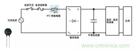 如下圖所示,通過插入NTC熱敏電阻來限制SMPS的勵磁涌流被廣泛地用作形成用于限制電源中的勵磁涌流的低成本簡易電路的方式。即使在整流器電路之后連接NTC熱敏電阻,也可以得到相同的結果。