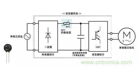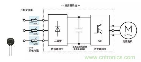 逆變器系統包括轉換器部分、逆變器部分和安裝在轉換器部分之后的直流鏈路電容器(平滑電容器)。啟動時,裝置充電,峰值比穩定電流大幾倍的勵磁涌流充滿直流鏈路電容器。這種勵磁涌流可能對直流電容器的使用壽命產生有害影響或破壞半導體器件。為了防止勵磁涌流,所以連接NTC熱敏電阻(電源熱敏電阻)。