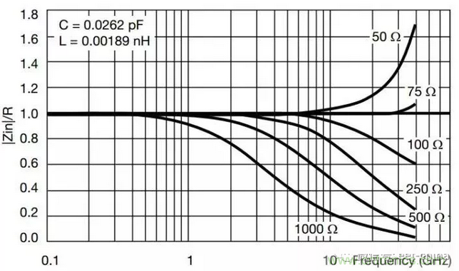 上圖電阻的高頻特性非常好,可以看到極間電容只有0.03pF,引線(xiàn)電感只有0.002nH,其中75Ω的電阻可以到30GHz。我們通常使用的貼片電阻大都是厚膜電阻,性能遠(yuǎn)達(dá)不到如此,其引線(xiàn)電感有幾個(gè)nH,極間電容也有幾個(gè)pF,大多只能用到幾百M(fèi)Hz或幾個(gè)GHz。