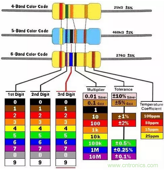 從左往右,前兩個(gè)或三個(gè)環(huán)代表數(shù)字,接下來(lái)的環(huán)代表乘數(shù),與前面的數(shù)字相乘便是阻值。再接下來(lái)的環(huán)代表電阻的容差,最后就是電阻的溫度系數(shù)。