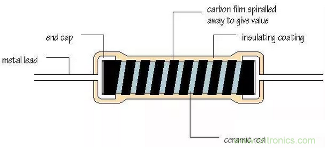 碳膜電阻主要是在陶瓷棒上形成一層碳混合物膜,例如直接涂一層,碳膜的厚度和其中碳濃度可以控制電阻的大小;為了更加精確的控制電阻,可以在碳膜上加工出螺旋溝槽,螺旋越多電阻越大;最后加金屬引線(xiàn),樹(shù)脂封裝成型。碳膜電阻的工藝更加復(fù)雜一點(diǎn),可以做精密電阻,但由于碳質(zhì)的原因,還是溫度特性不太好。