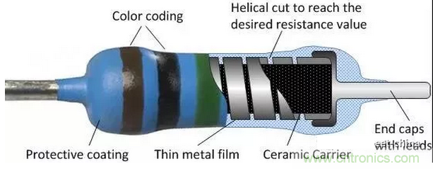 與碳膜電阻結(jié)構(gòu)類(lèi)似,金屬膜電阻主要是利用真空沉積技術(shù)在陶瓷棒上形成一層鎳鉻合金鍍膜,然后在鍍膜上加工出螺旋溝槽來(lái)精確控制電阻。金屬膜電阻可以說(shuō)是性能比較好的電阻,精度高,可以做E192系列,然后溫度特性好,噪聲低,更加穩(wěn)定。